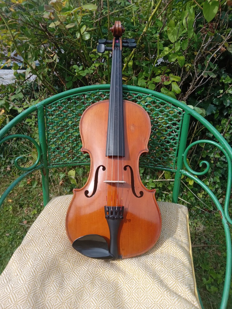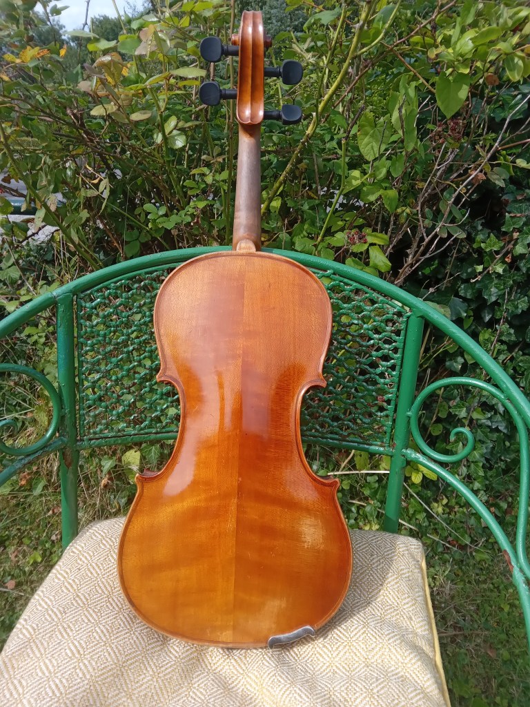 Old German violin recently refurbished by myself with new ebony pegs, fingerboard, chinrest, Wittner finetuner tailpiece and Pirastro tonica strings. This violin has a warm and sweet tone with good volume and projection. All the cracks in the top have been fully glued, cleated and sealed. Comes without case and bow. €850. SOLD.