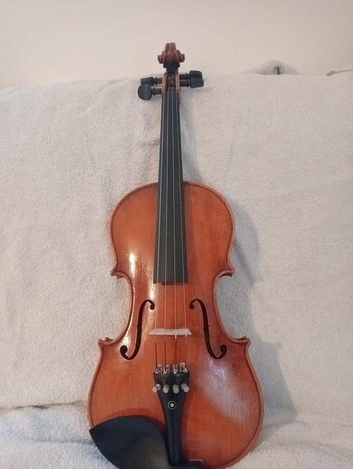 2014 (4/4) Chinese handcrafted violin (Stradivari pattern). This instrument has a clear strong tone and is easy to play with a low action. The violin has a new bridge, sound-post and is fitted with Dogal strings. The tailpiece (with four individual fine tuners), chinrest, pegs and fingerboard are all made of ebony. €500.