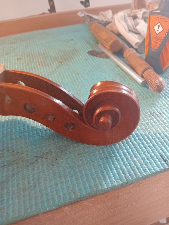 Cleaning deeply fused resin from the scroll of a early 1900’s Mirecourt violin.